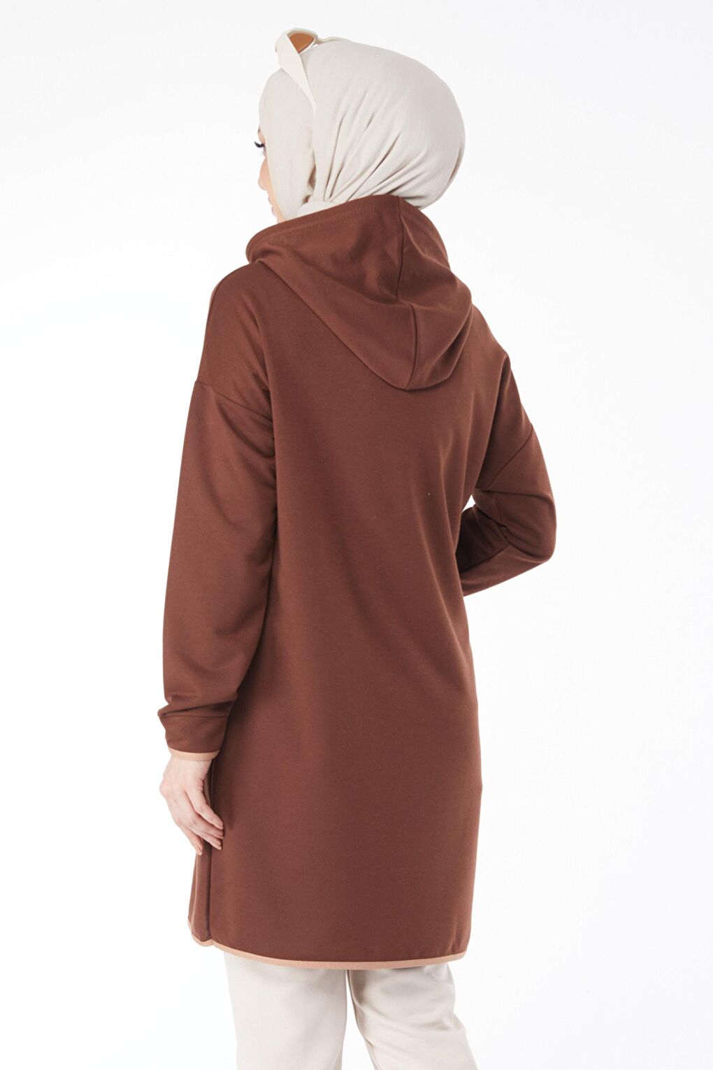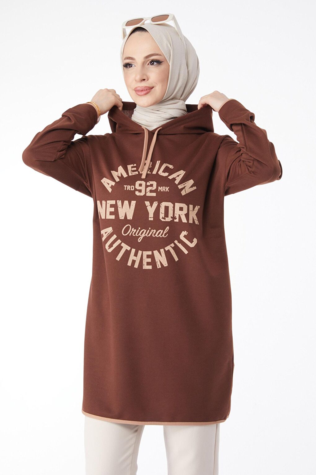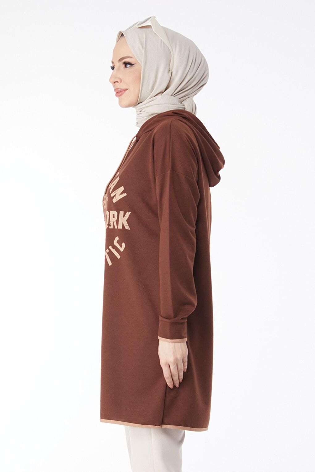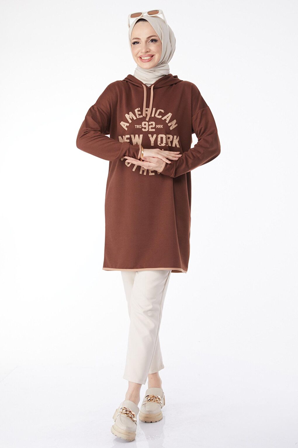 - نام : Düz Kapşonlu Yaka Kadın Kahverengi Önü Baskılı Sweatshirt - 13130