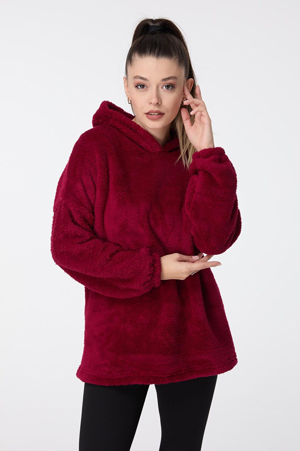 - نام : Düz Kapşonlu Yaka Kadın Bordo Peluş Sweat - 13049