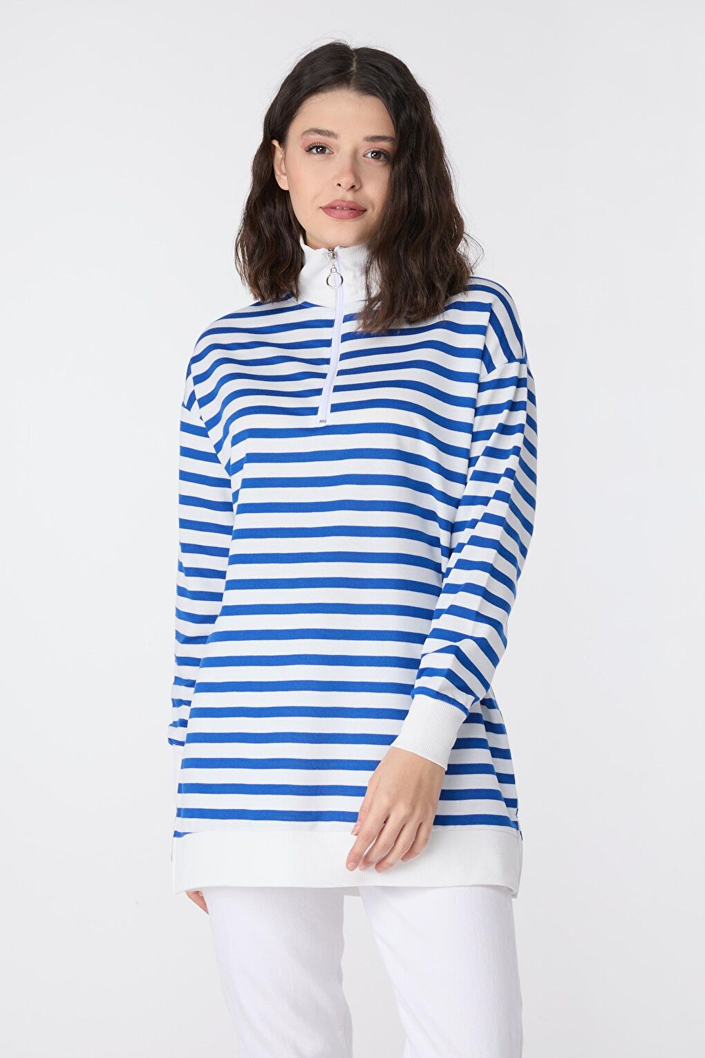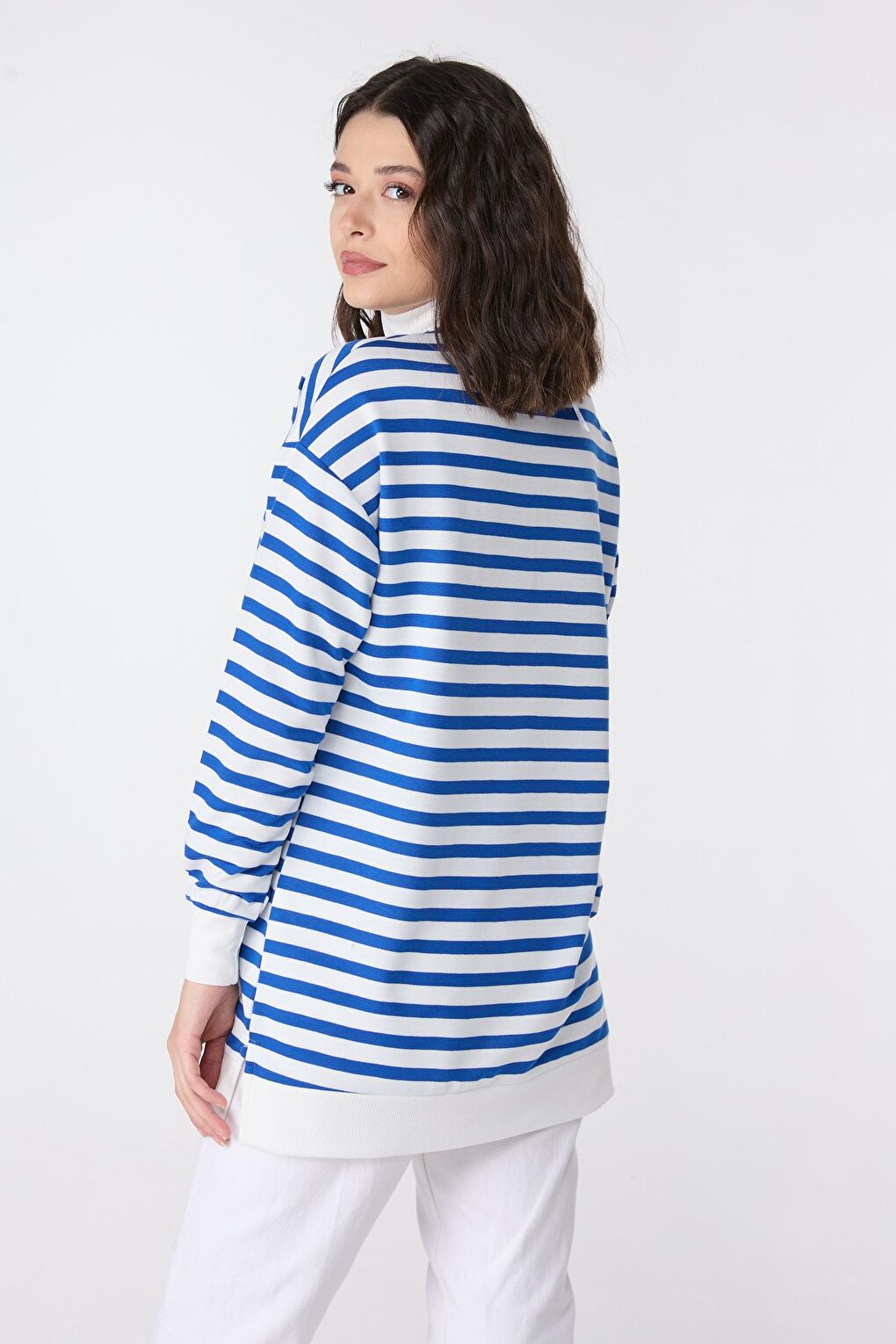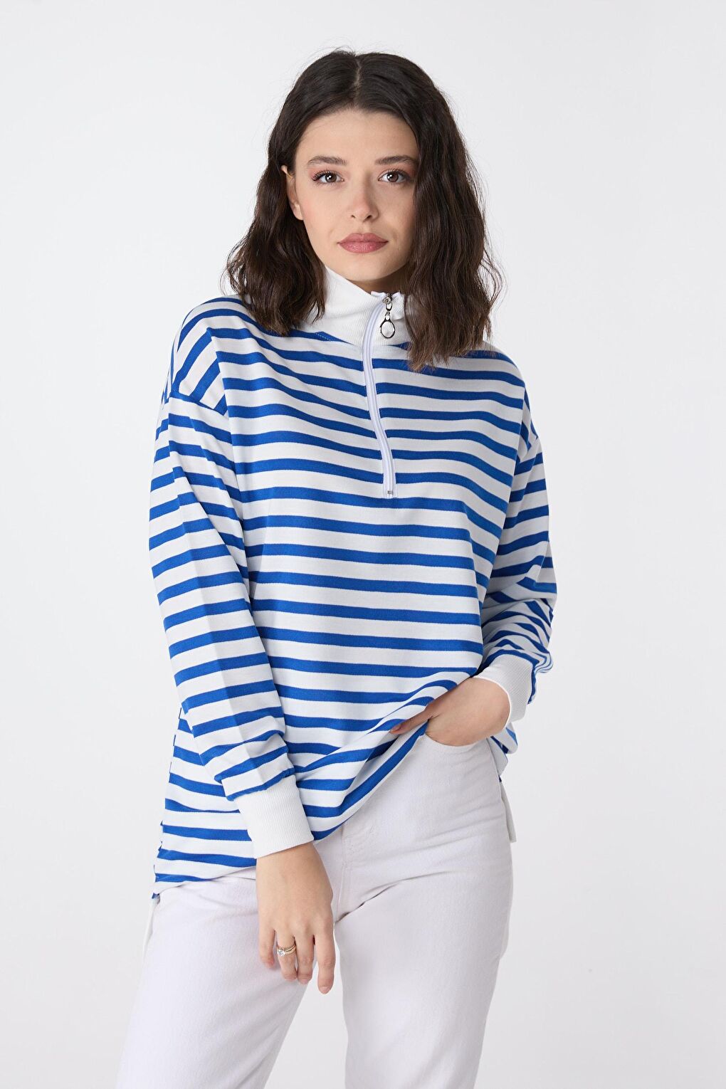 - نام : Düz Yarım Balıkçı Yaka Kadın Mavi Çizgili Sweat - 23892