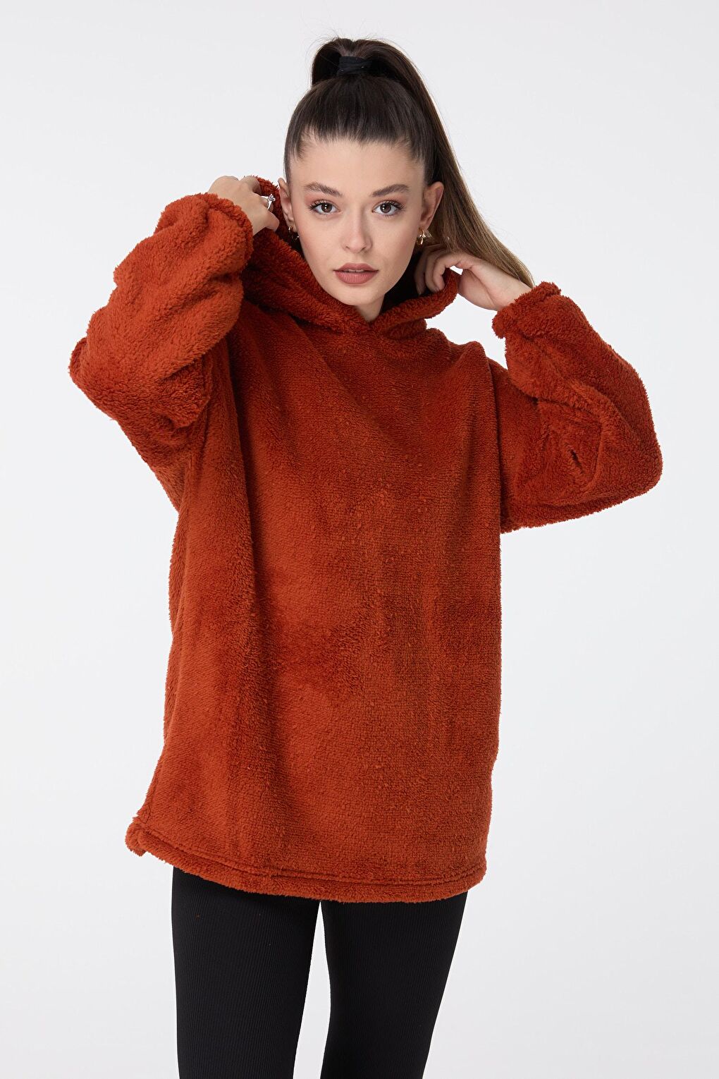 - نام : Düz Kapşonlu Yaka Kadın Kiremit Peluş Sweat - 13049
