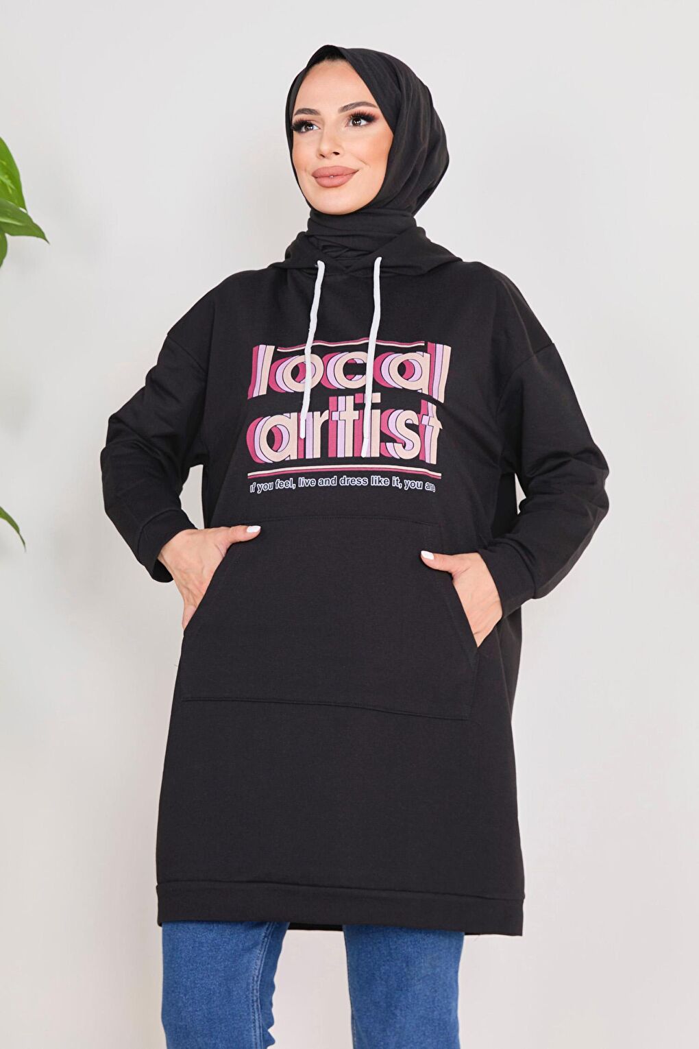 - نام : Düz Kapşonlu Yaka Kadın Siyah Kapşonlu Sweat - 23015