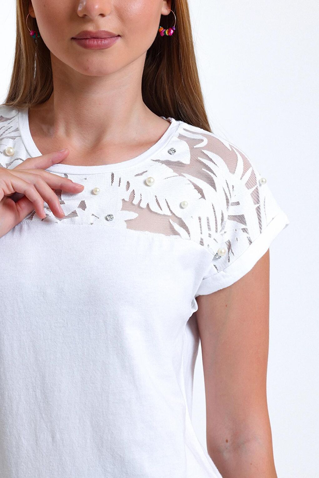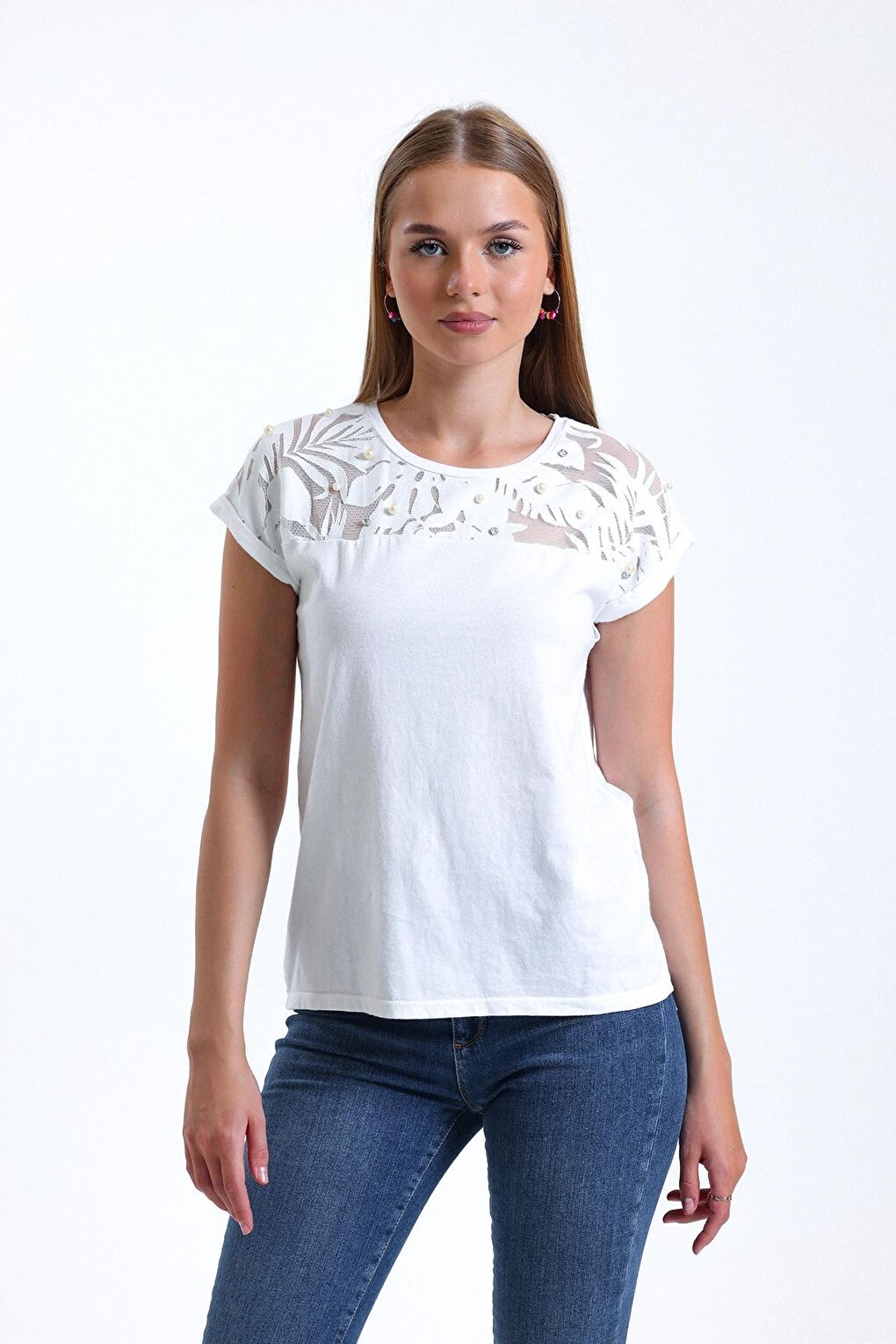 - نام : Yakası Dantel Boncuk Detaylı İşlemeli Bisiklet Yaka Yarım Kol Bluz VLMB-414-B