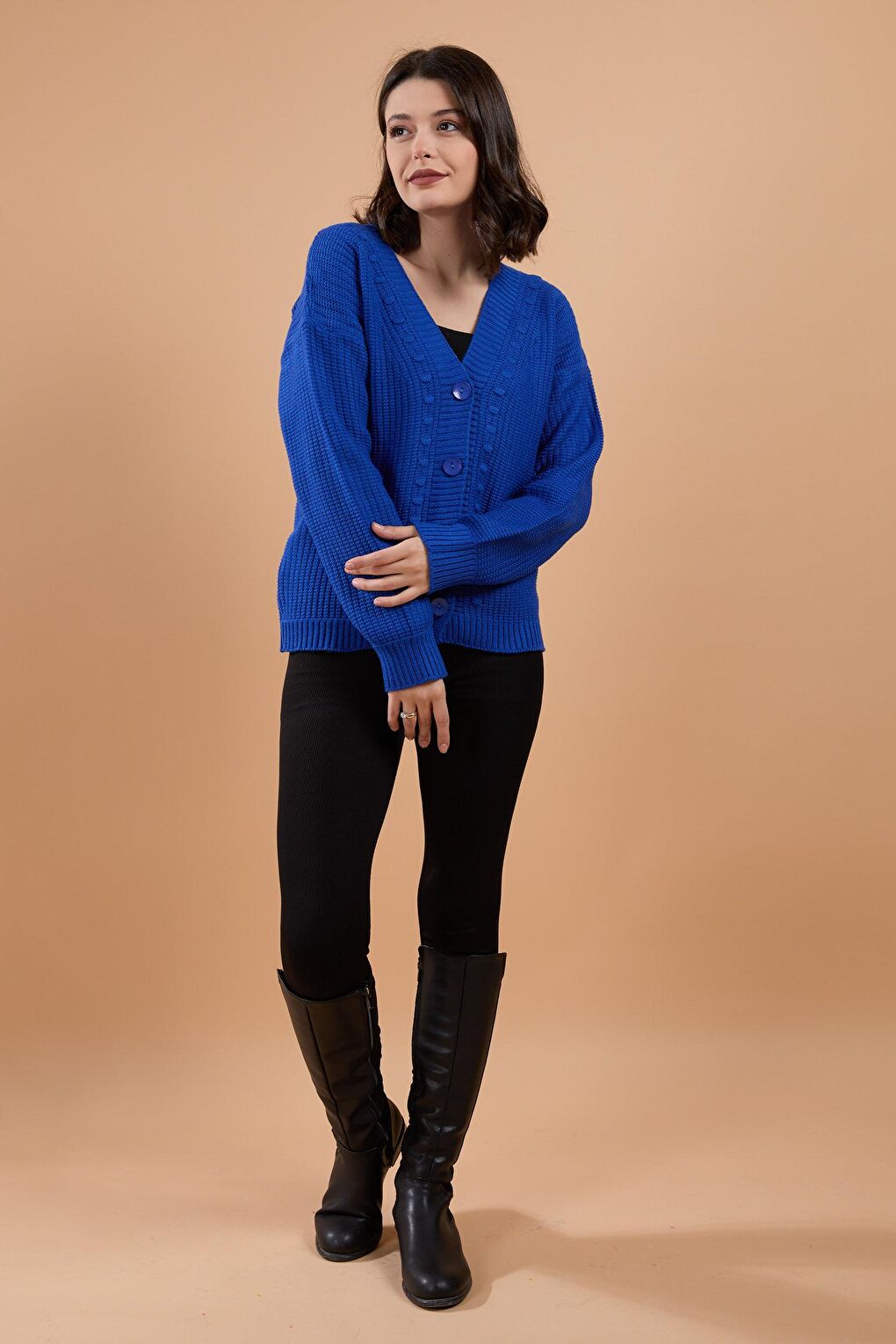 - نام : Düz Kruvaze Yaka Kadın Mavi Triko Hırka - 23768