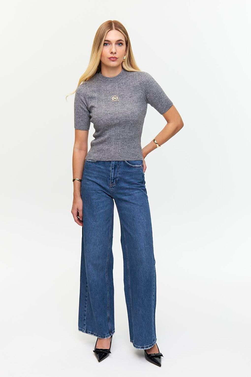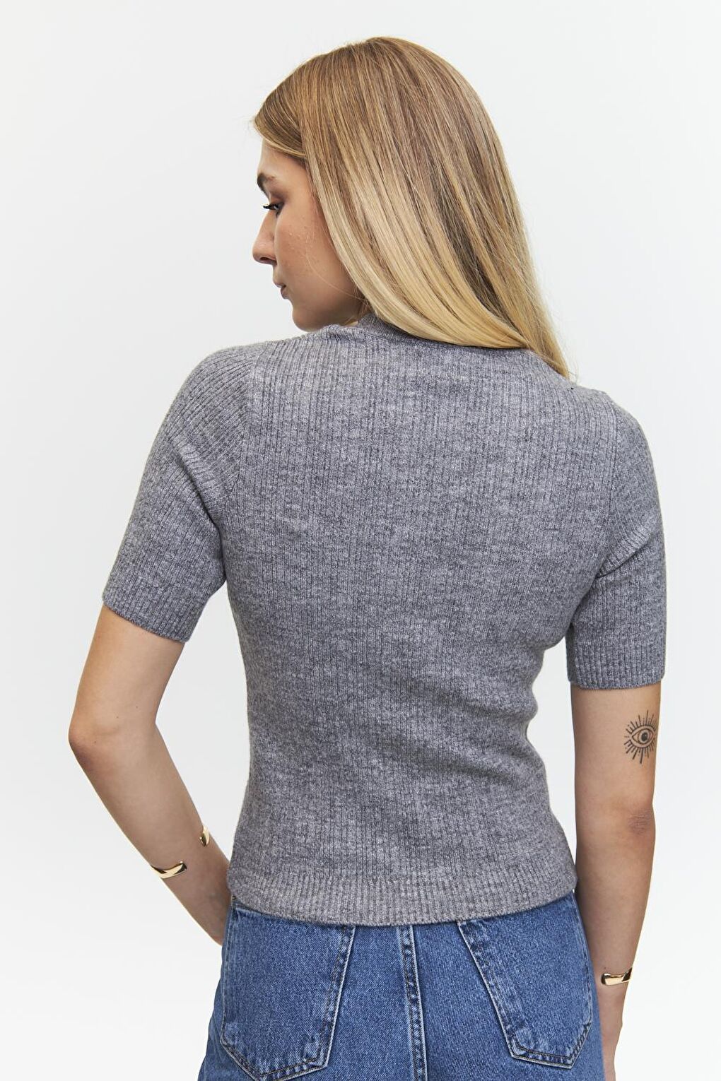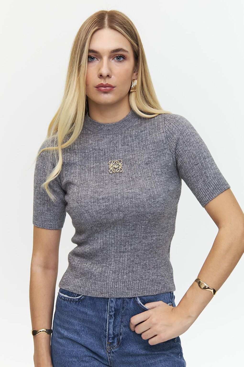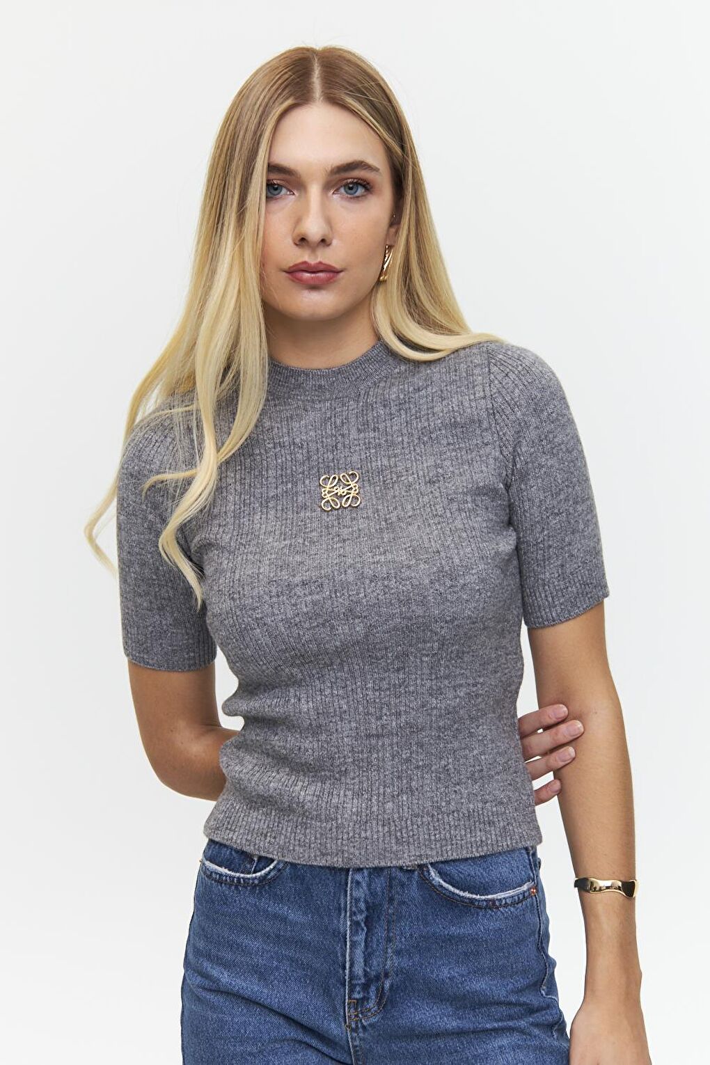 - نام : Bisiklet Yaka Kısa Kollu Gri Triko Bluz