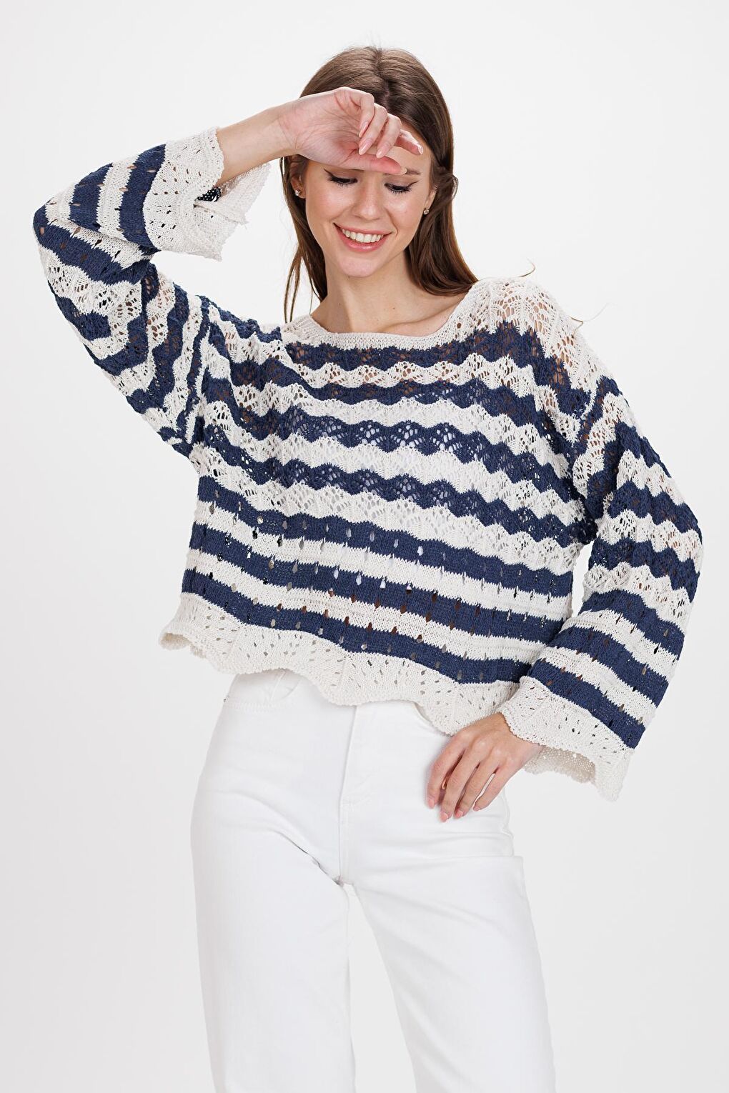 - نام : Kadın Lacivert Bisiklet Yaka Zigzag Çizgili Ajurlu Oversize Triko Kazak