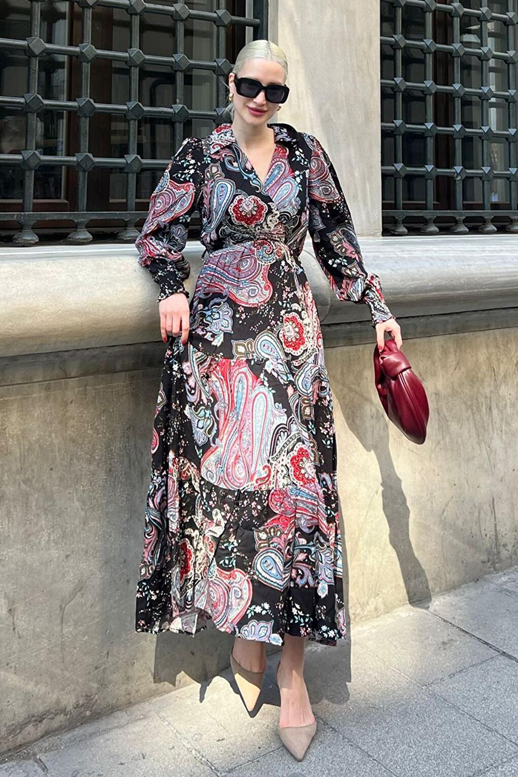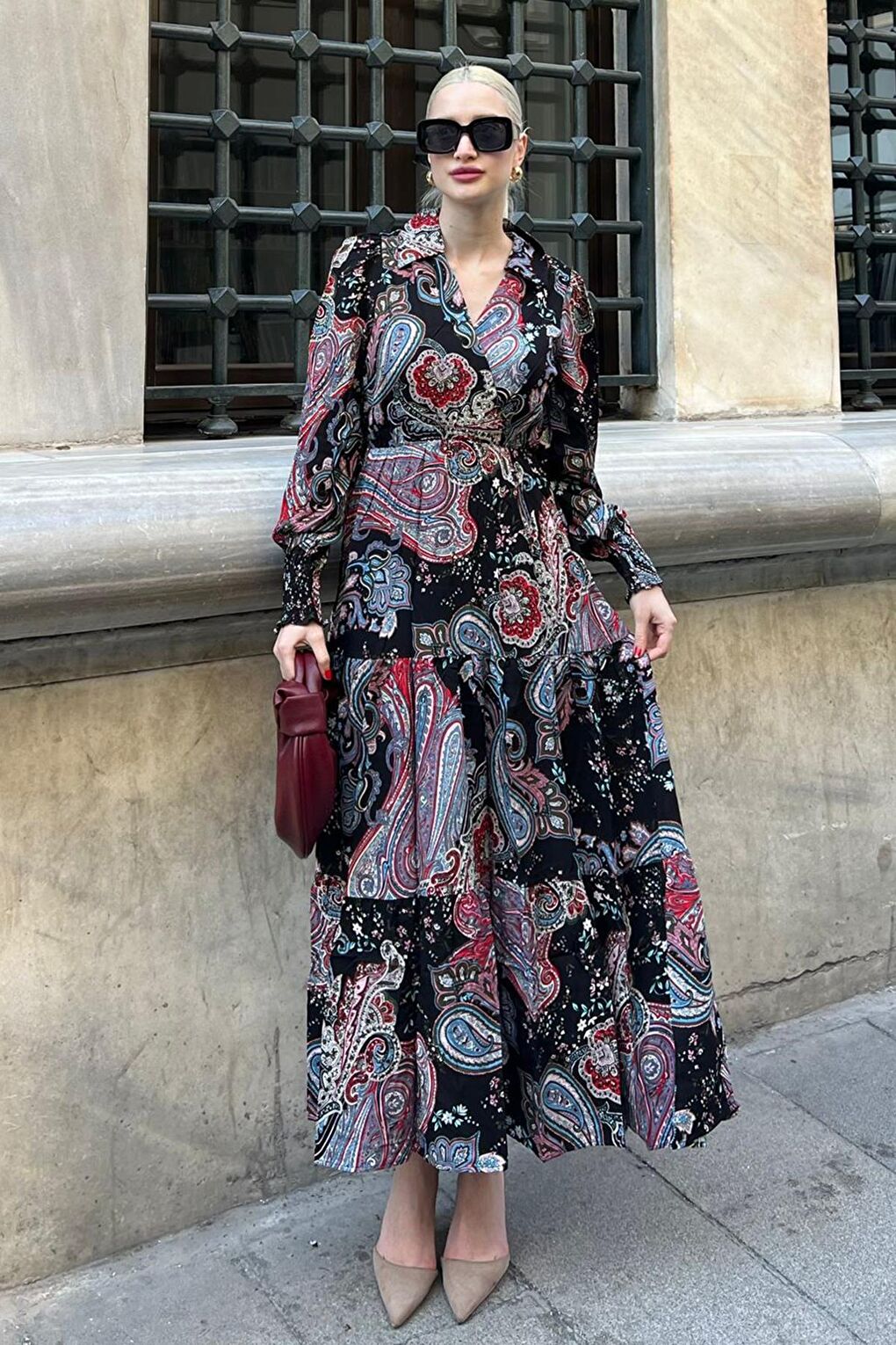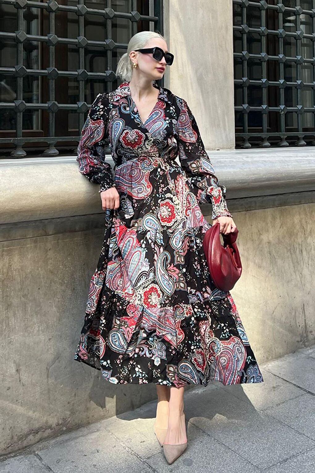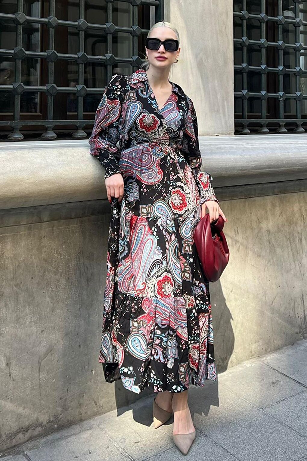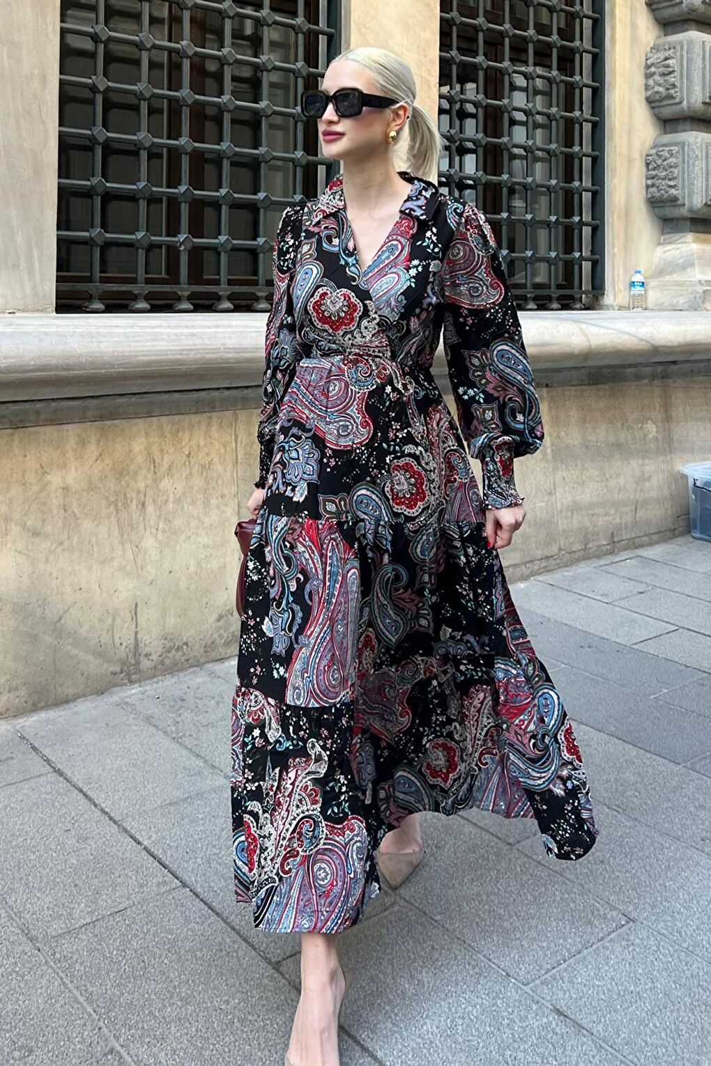 - نام : Siyah Şal Desenli Kruvaze Yaka Uzun Kadın Elbise MG2048
