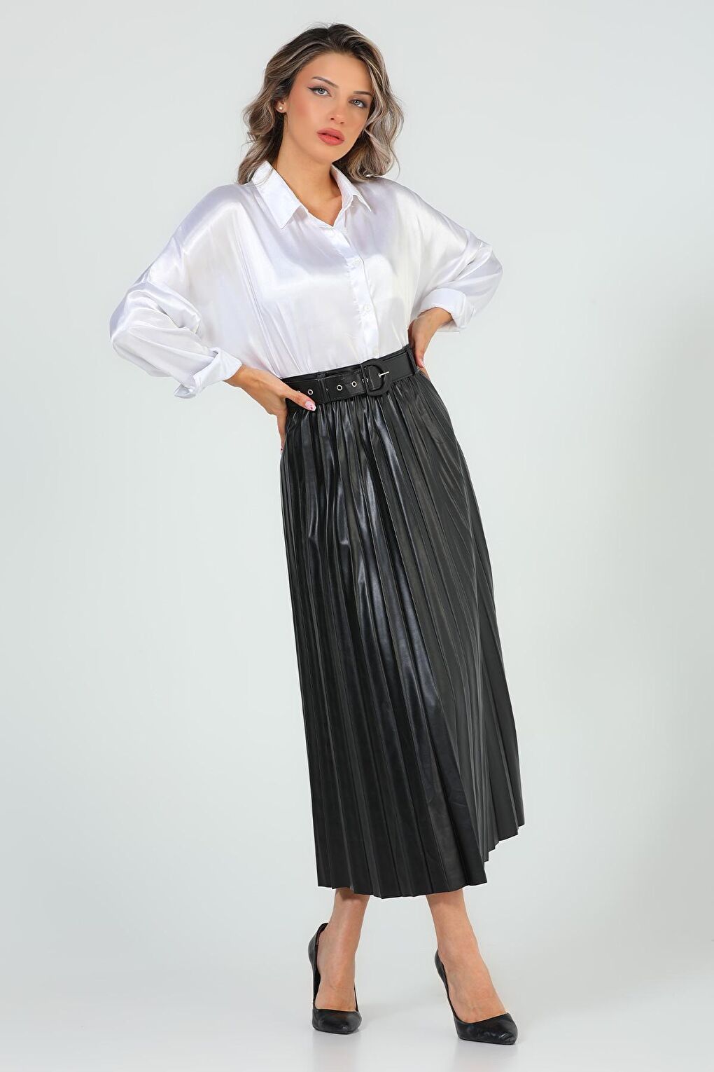 - نام : Kadın Bel Kemerli Pileli Uzun Deri Etek