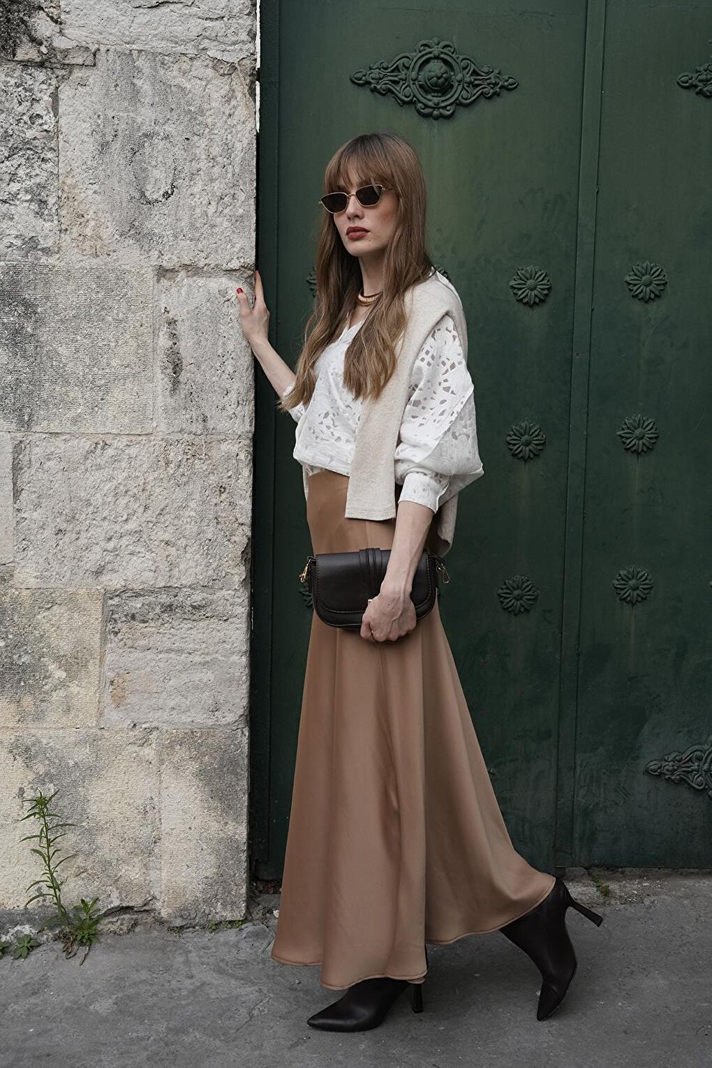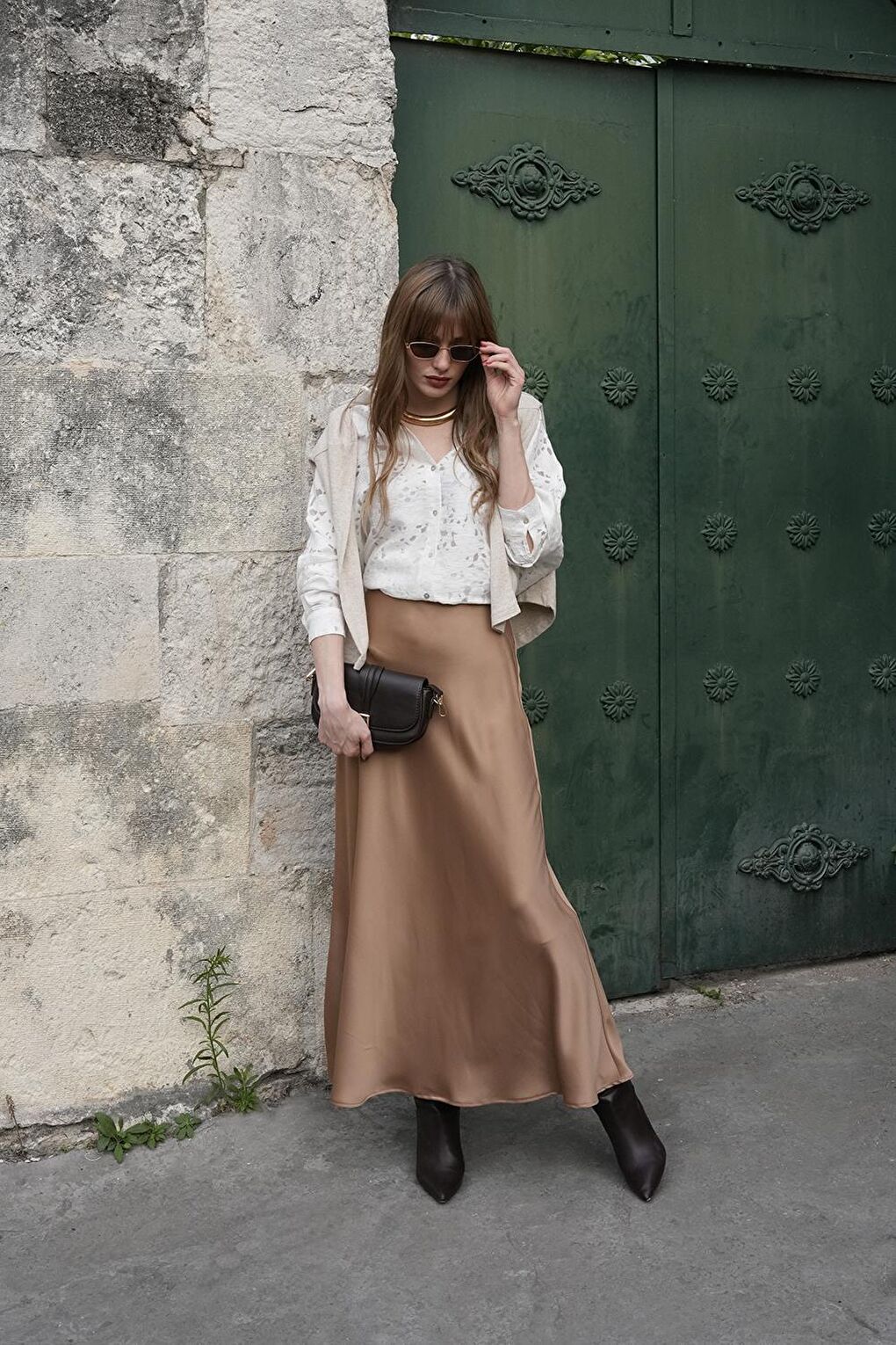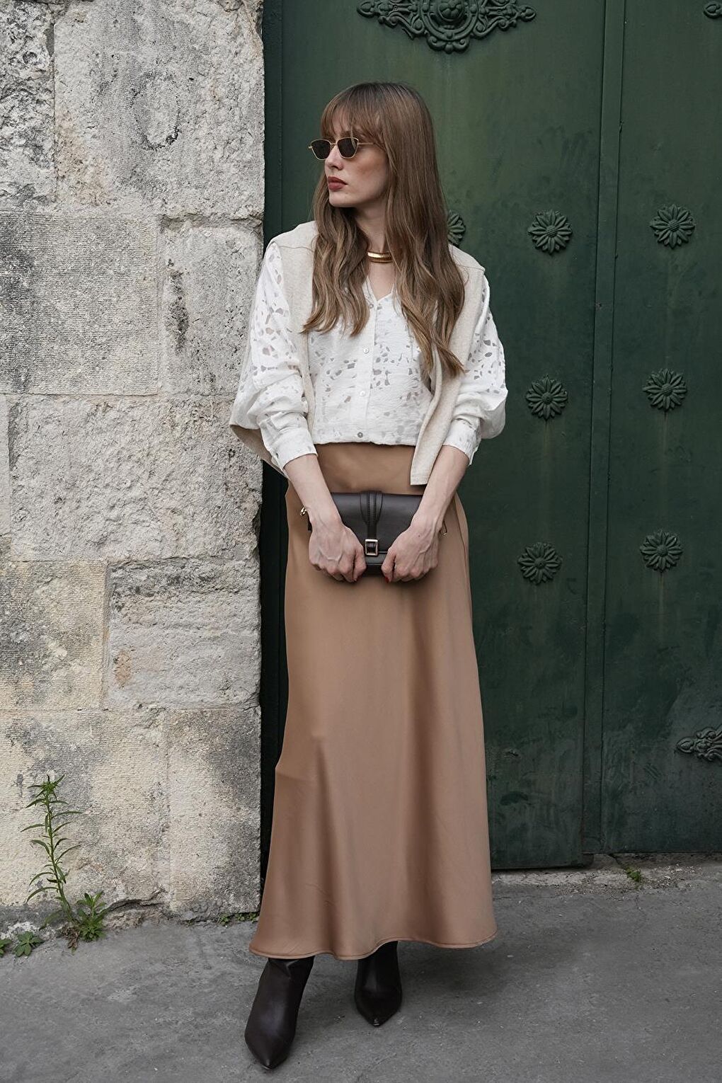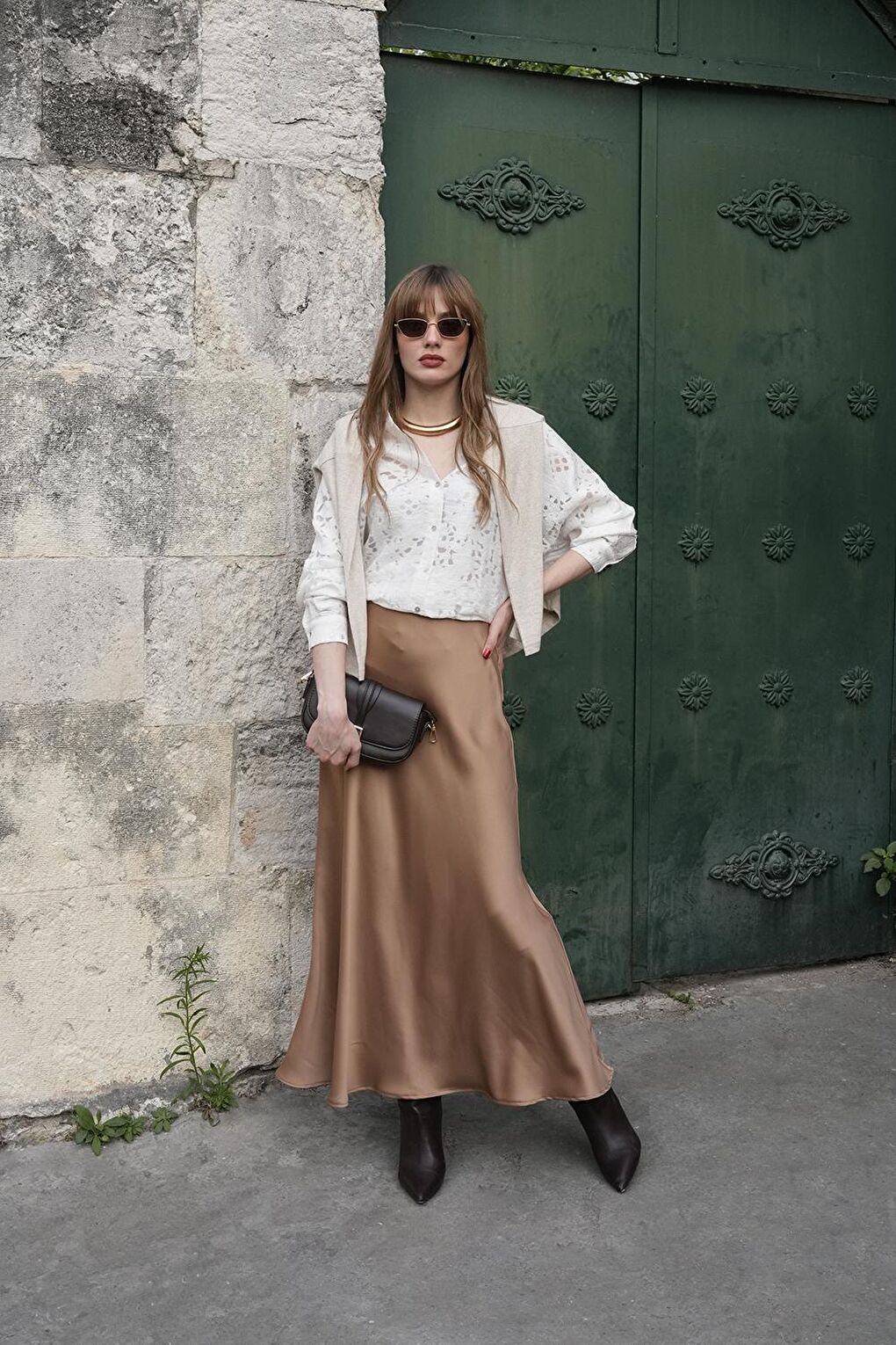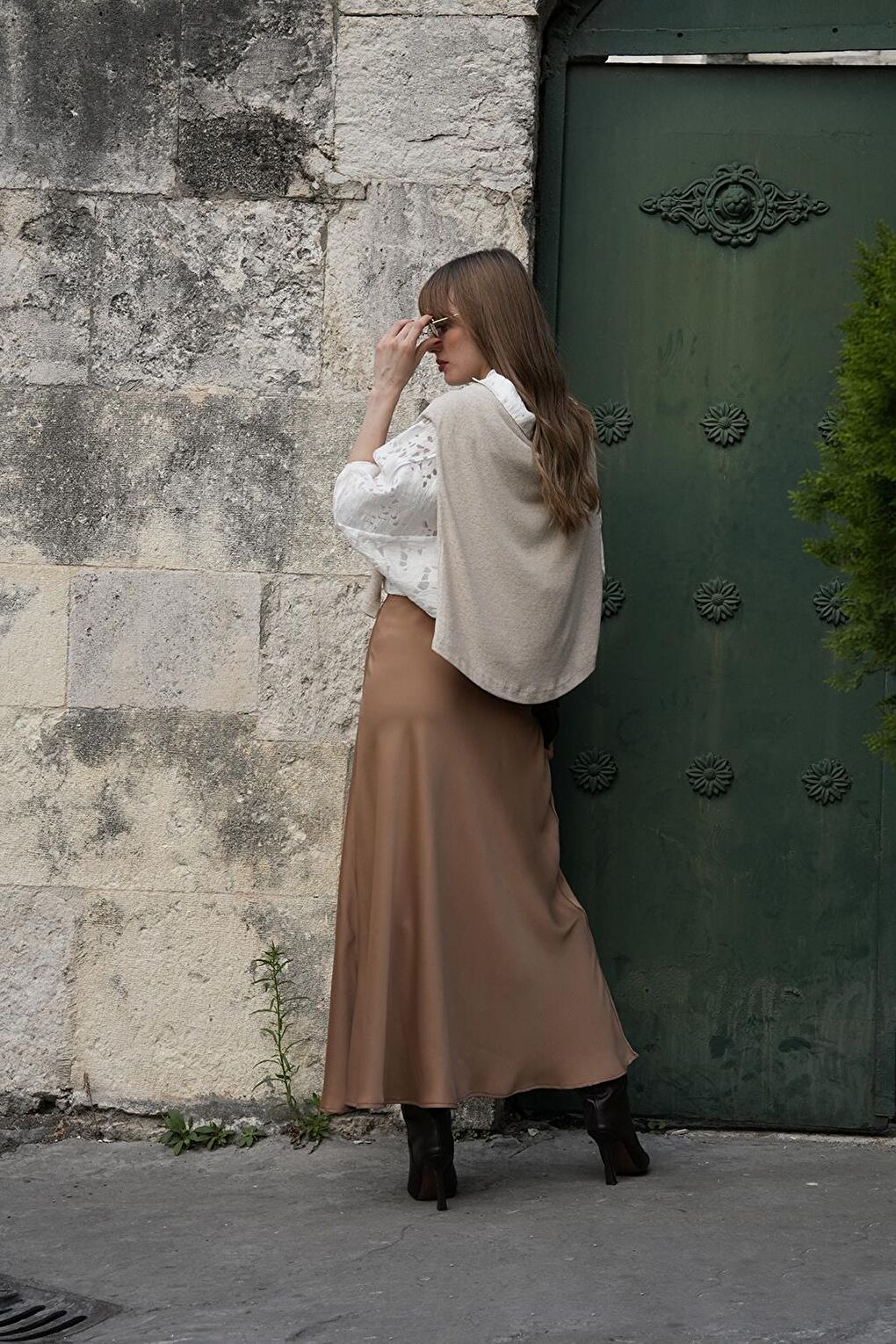 - نام : Beli Lastikli Saten Açık Kahverengi Etek