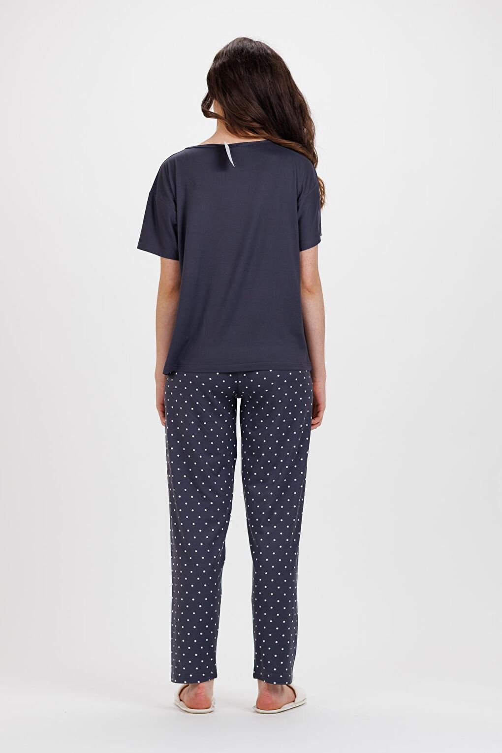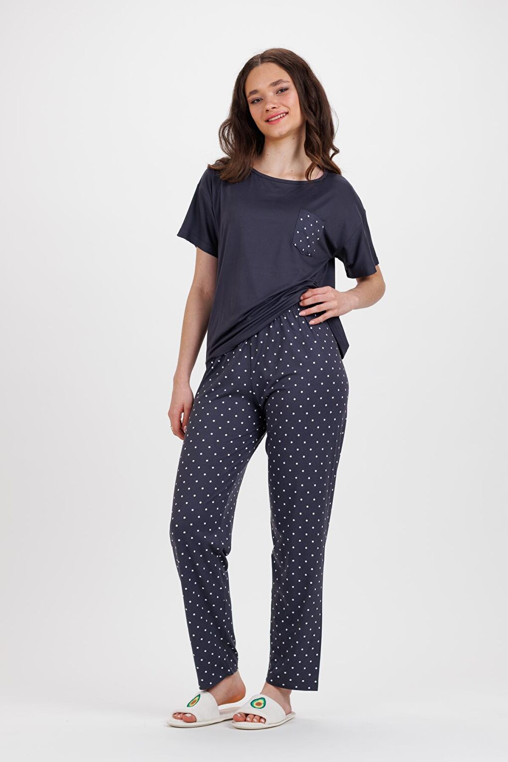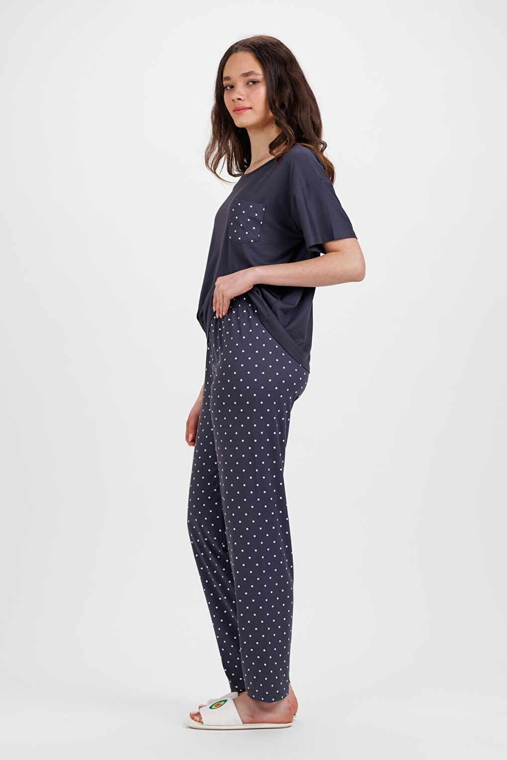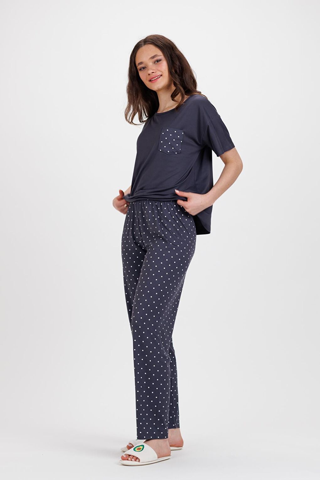 - نام : Kadın Gri Puanlı T.Shırt Cepli Bisiklet Yaka Uzun Alt Pijama Takım
