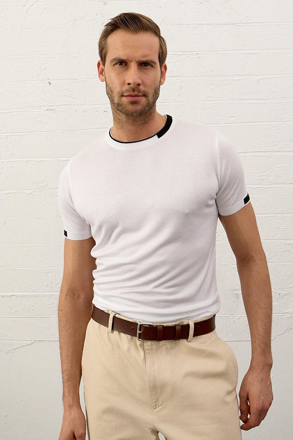 - نام : Erkek Garnili Slim-Fit Yazlık Triko T-shirt Beyaz