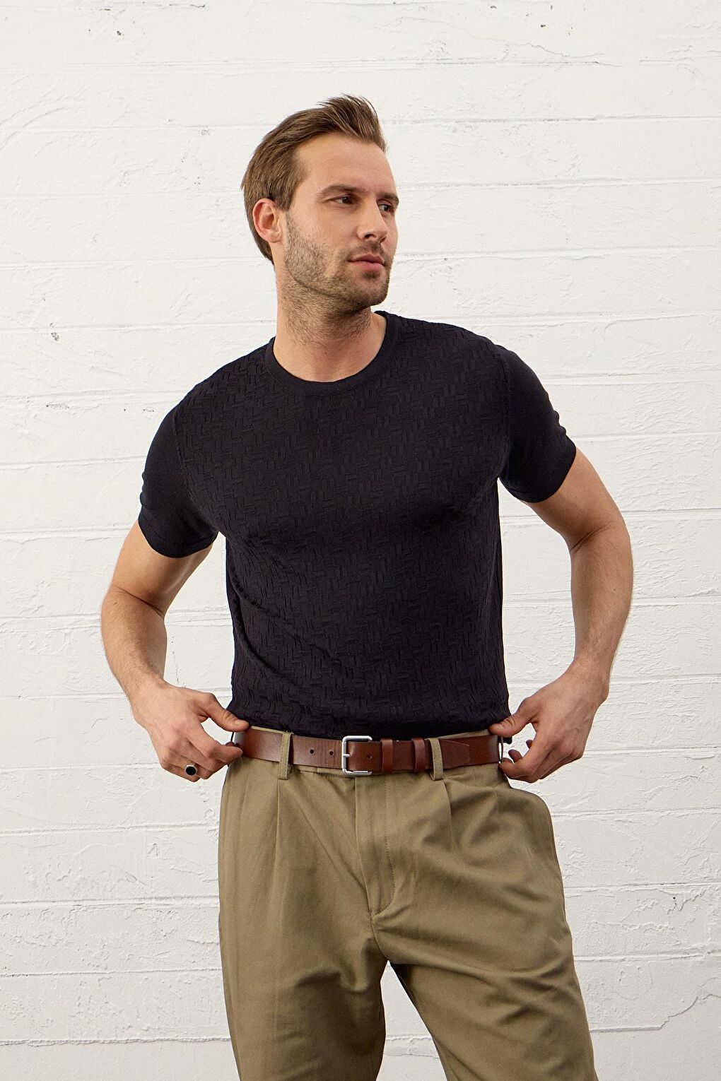 - نام : Erkek Desenli Bisiklet Yaka Slim-Fit İnce Triko Tişört Siyah