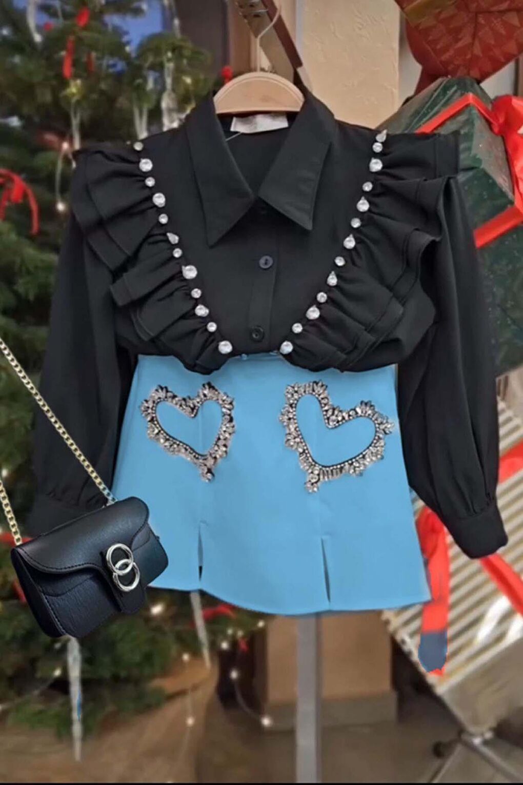 - نام : Kız Çocuk Taş İşlemeli Fırfırlı Mavi Etekli Takım